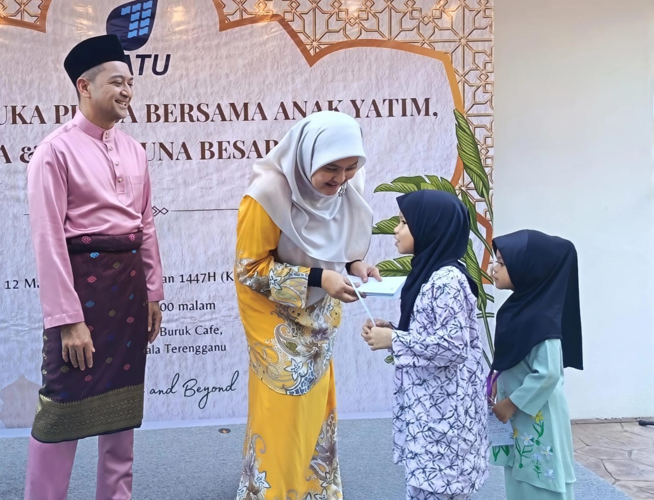 Abdul Karim (kiri) menyampaikan duit raya kepada sebahagian anak yatim pada majlis Iftar Perdana Satu di Hotel Permai, Kuala Terengganu semalam.