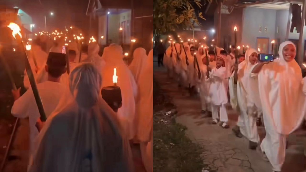 Rakaman video dikongsi di platform Instagram oleh akaun @mangentemaluku menunjukkan penduduk tempatan termasuk kanak-kanak berarak sambil membawa sebatang kayu yang dinyalakan api.