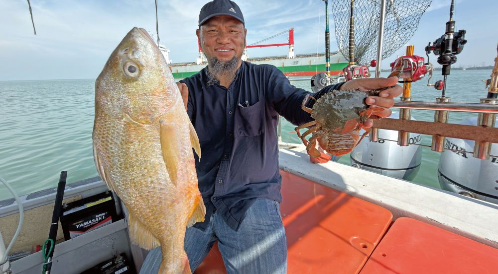 Haji Amin dengan ikan gerut-gerut saiz 2.5kg dan seekor ketam nipah yang tercangkuk sekali.