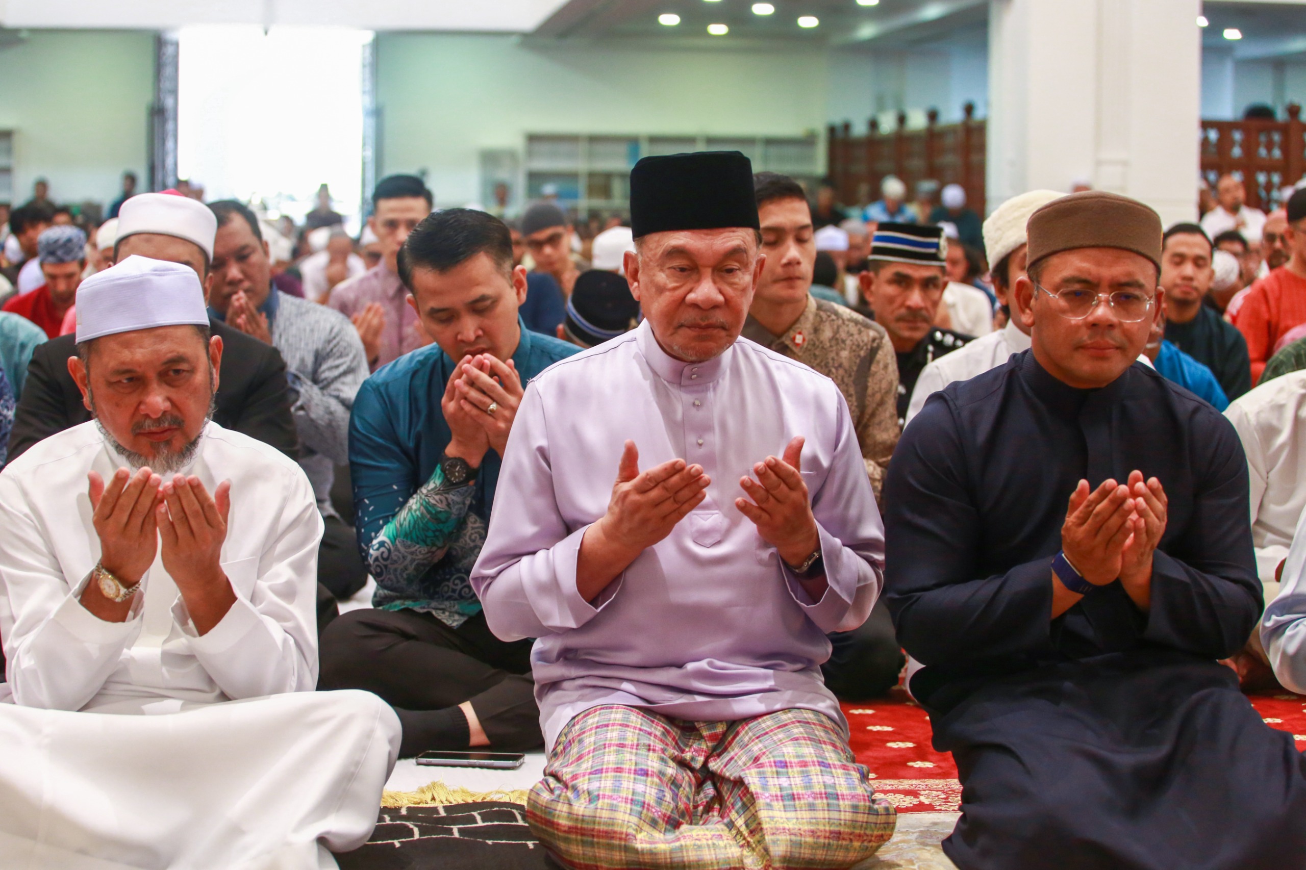 Anwar ketika mengaminkan doa selepas menunaikan solat Jumaat di Masjid Tengku Ampuan Jemaah, Shah Alam. FOTO: AFIQ RAZALI