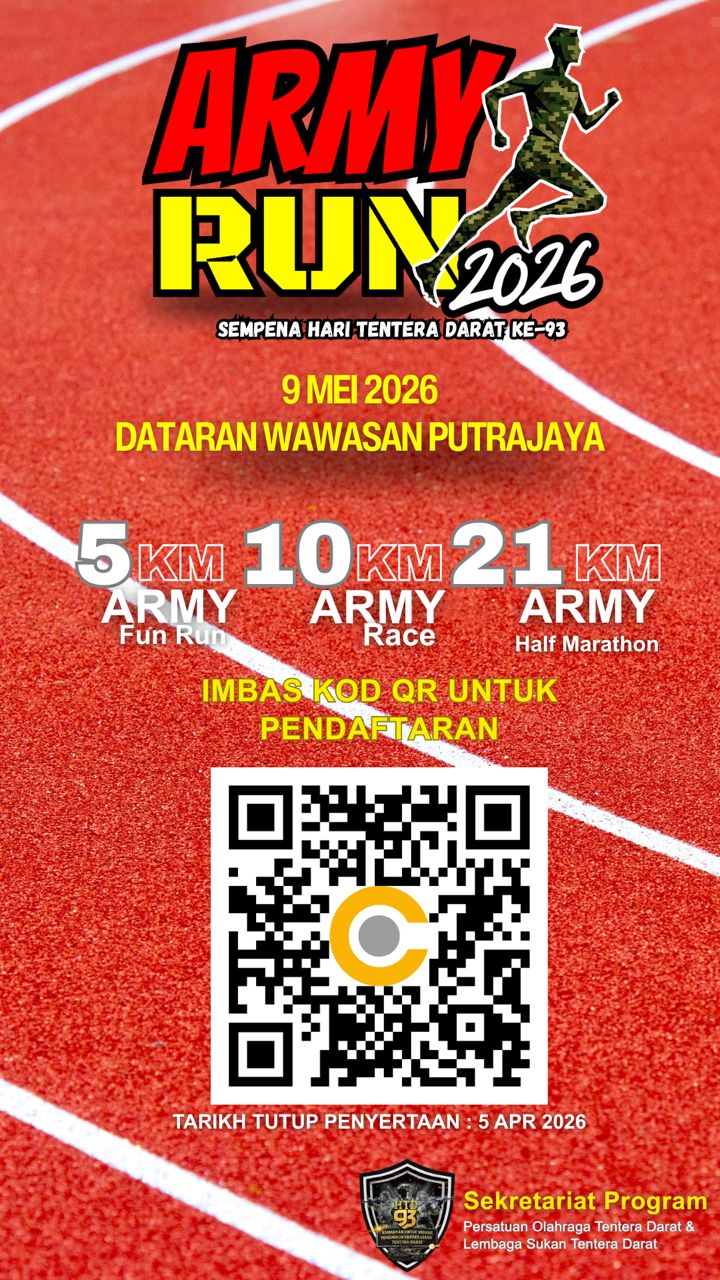 Tentera Darat Malaysia turut menjemput seluruh rakyat Malaysia untuk sama-sama menyertai Army Run 2026 sempena Sambutan Hari Tentera Darat Ke-93 yang akan diadakan pada 9 Mei 2026 bertempat di Dataran Wawasan, Putrajaya.-KOSMO! ONLINE