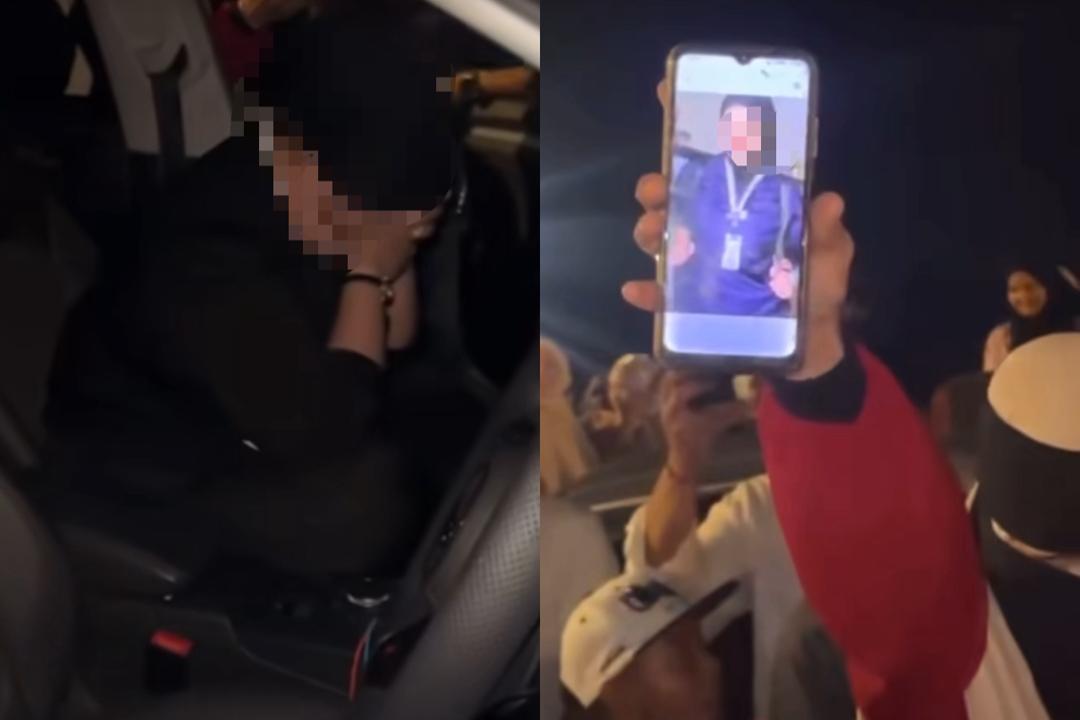 Menerusi hantaran oleh @Shashaulala di laman Threads, kelihatan seorang wanita bertindak menunjukkan wajah individu berkenaan ke arah kamera dan turut memperlihatkan orang ramai mengerumuni kenderaan tersebut.