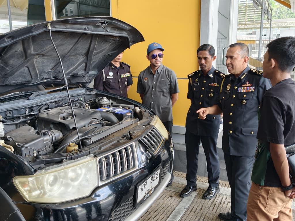 Shamsul Nizam (dua dari kanan) melakukan pemeriksaan ke atas sebuah kenderaan Thailand di Kompleks ICQS Bukit Kayu Hitam, hari ini.