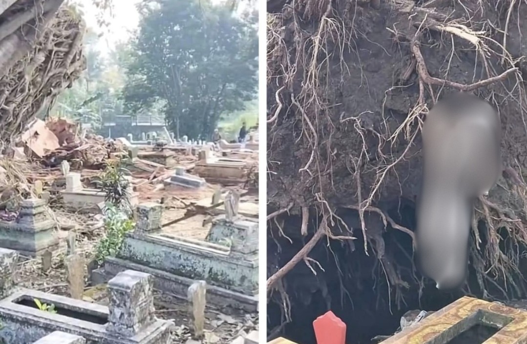 Ia menyebabkan satu jenazah berbalut kain kafan lusuh turut terangkat ke permukaan, selain beberapa batu nisan rosak.