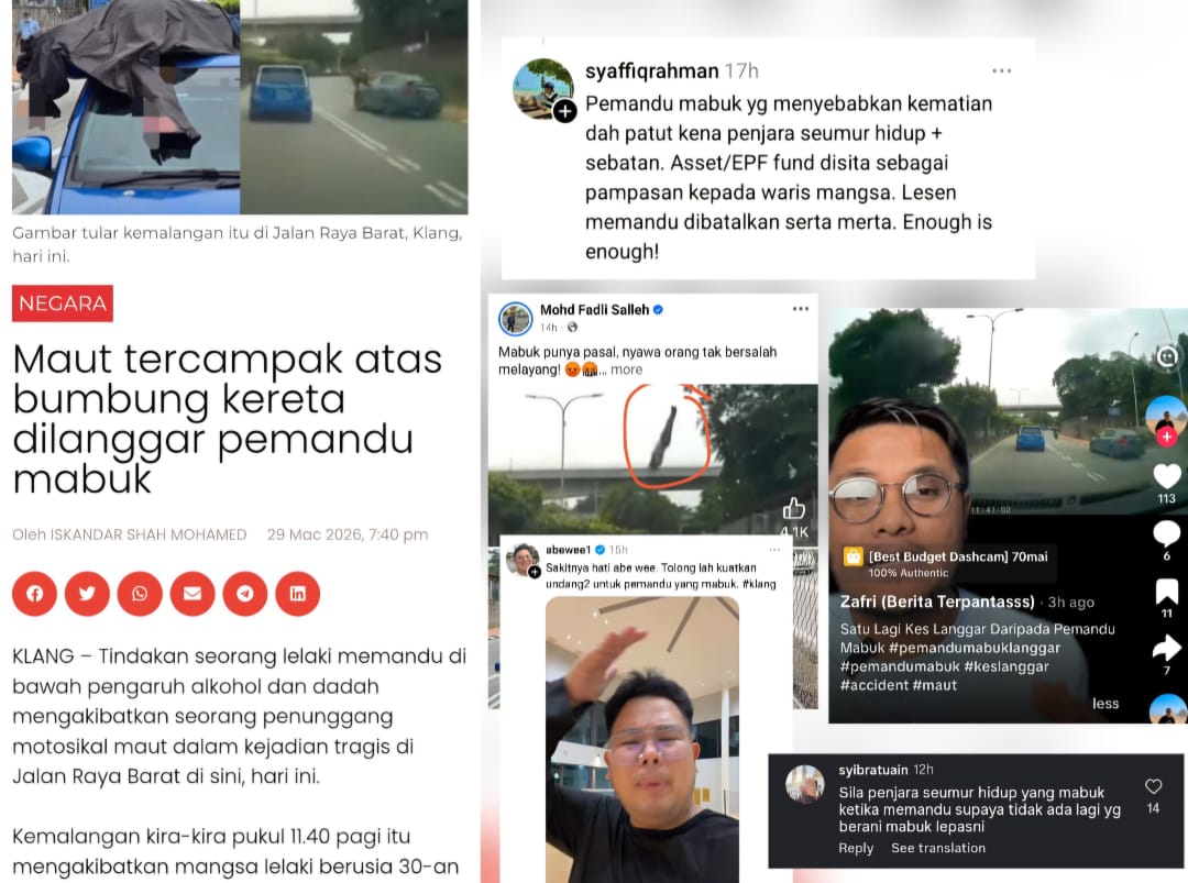 PETALING JAYA – Media sosial hari ini dibanjiri dengan luahan sedih, geram dan kemarahan orang ramai susulan insiden kemalangan melibatkan seorang penunggang motosikal yang maut dilanggar pemandu mabuk di Jalan Raya Barat, Klang semalam.