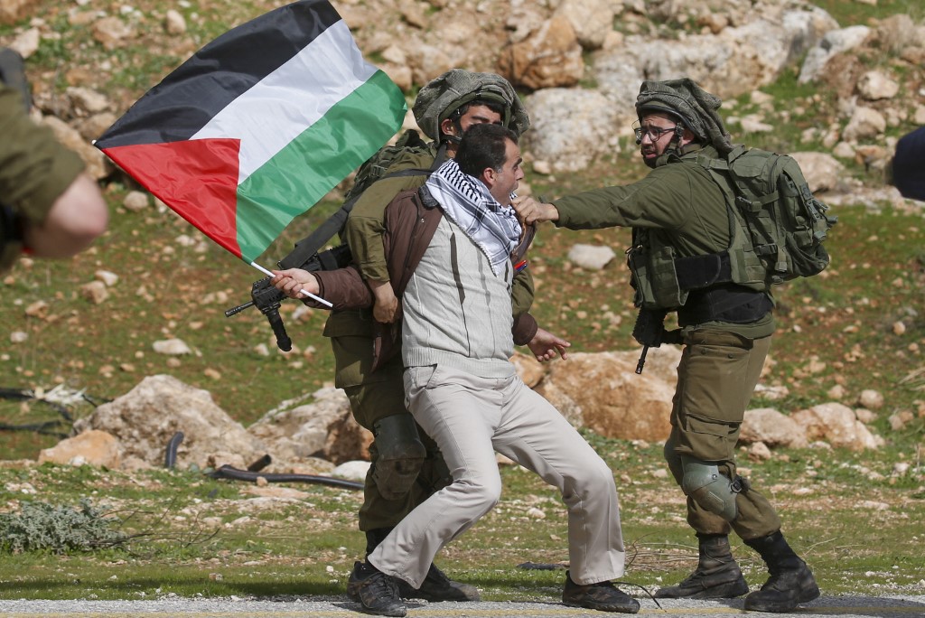 Seorang rakyat Palestin ditahan oleh tentera Israel semasa protes berhampiran kampung Tubas di Tebing Barat pada 29 Januari 2020. - AFP
