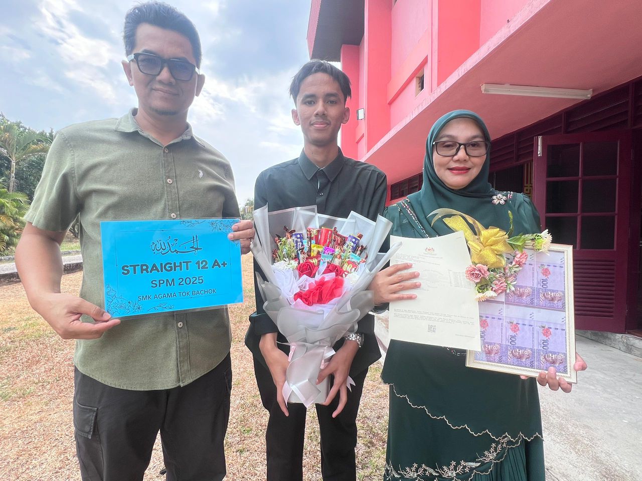 Muhammad Izz (tengah) bersama ibu dan bapanya semasa pengumuman keputusan SPM 2025 di SMKA Tok Bachok, Bachok hari ini. Foto oleh TOREK SULONG/KOSMO!