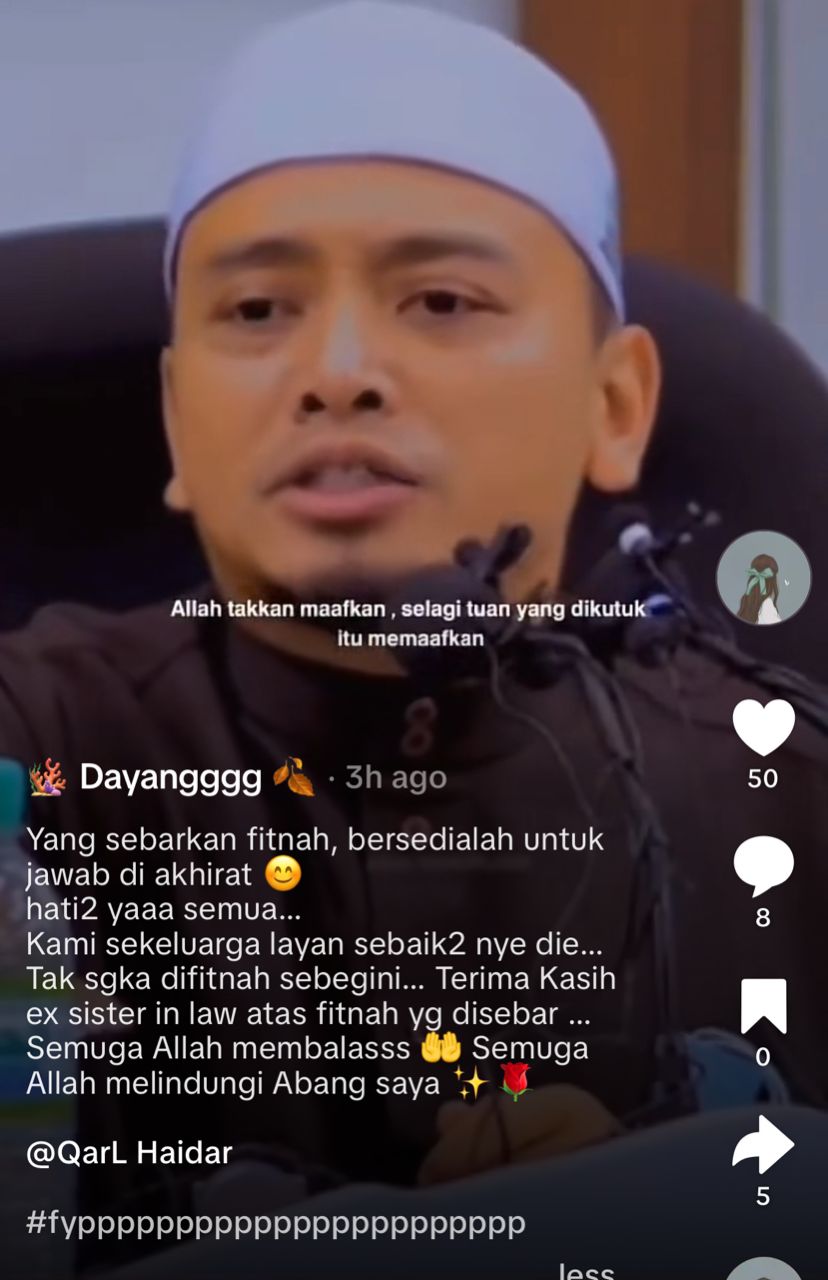 “Terima kasih bekas kakak ipar atas fitnah yang disebar. Semoga Allah SWT membalas dan semoga Tuhan melindungi abang saya,” katanya dalam satu hantaran TikTok.