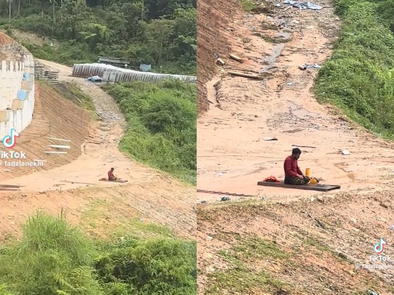 Menerusi video dikongsikan pengguna TikTok Fadzlan Lazim memperlihatkan, pekerja warga asing itu sedang melakukan tahiyat akhir di dalam solat yang dilaksanakan di atas satu papan diletakkan di atas tanah kawasan lapang.