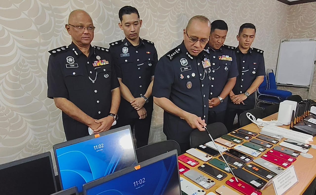 NOOR Hisam (tengah) menunjukkan rampasan dalam serbuan di sebuah inap desa di Bagan Datuk yang dijadikan sebagai pusat panggilan operasi pelaburan mata wang kripto tidak wujud.