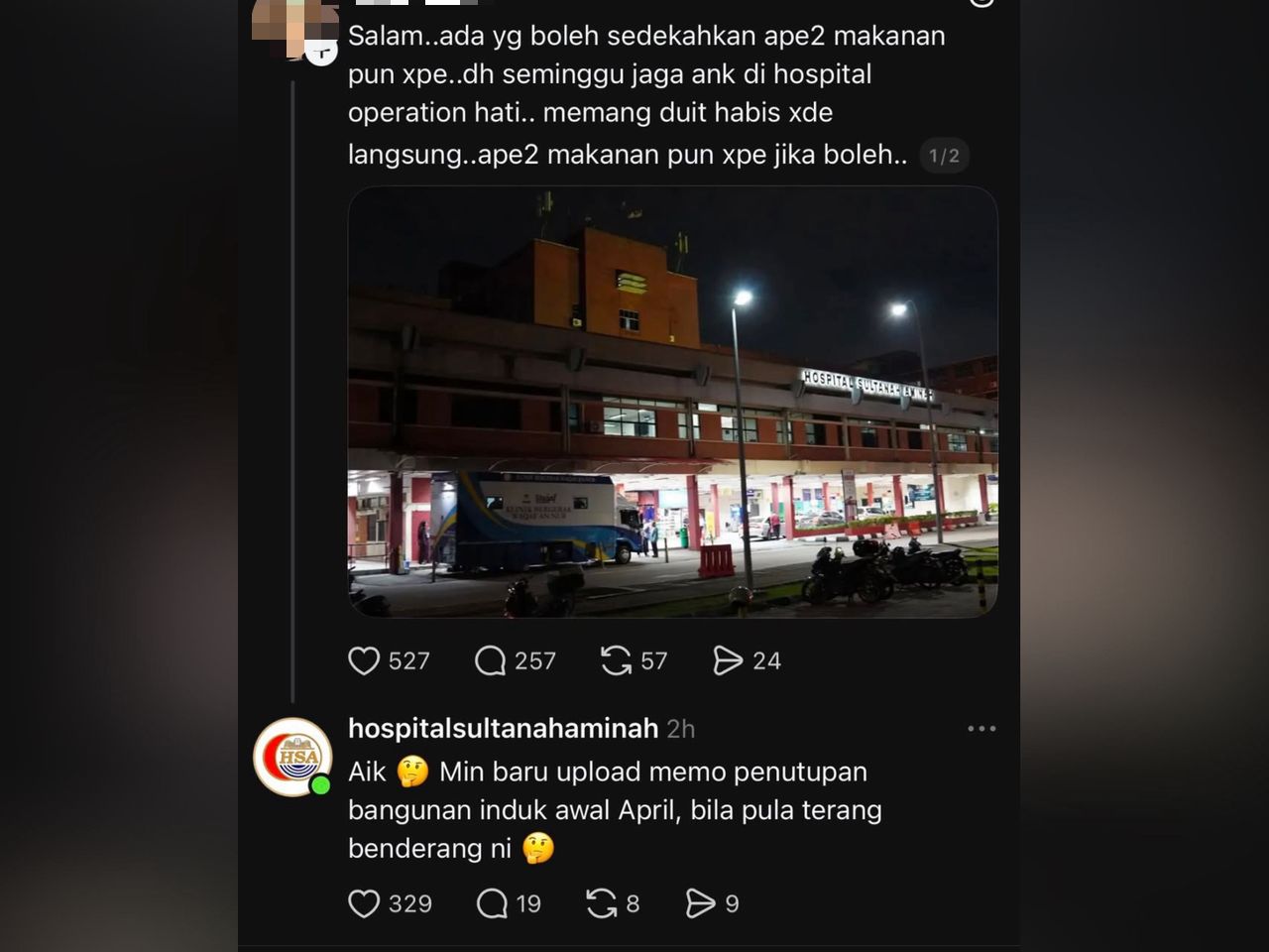 Menerusi satu hantaran di Threads, ia bermula apabila seorang pengguna memuat naik sekeping foto menunjukkan bangunan hospital pada waktu malam dengan mendakwa dirinya kini kesempitan wang.
