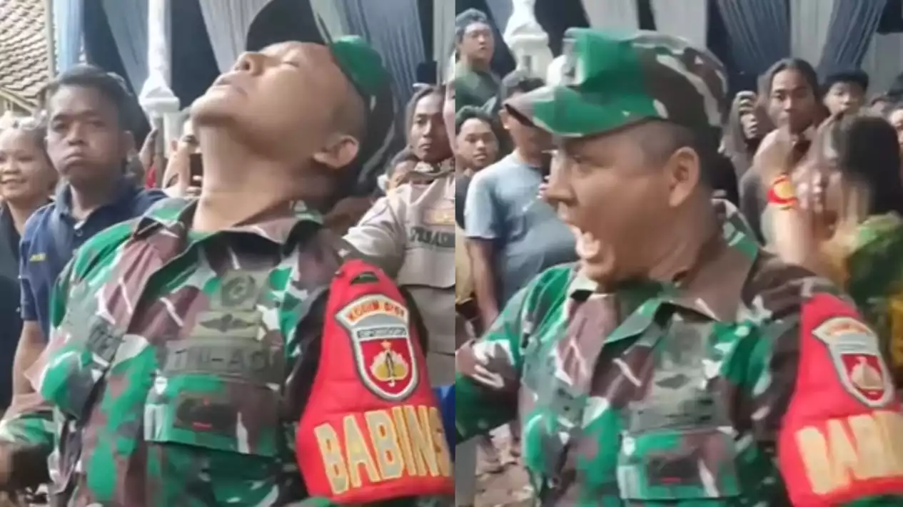 Dalam video yang dimuat naik di platform Instagram, anggota tentera lengkap beruniform itu pada awalnya mengawal keadaan sebelum dia mula melakukan gerakan aneh.