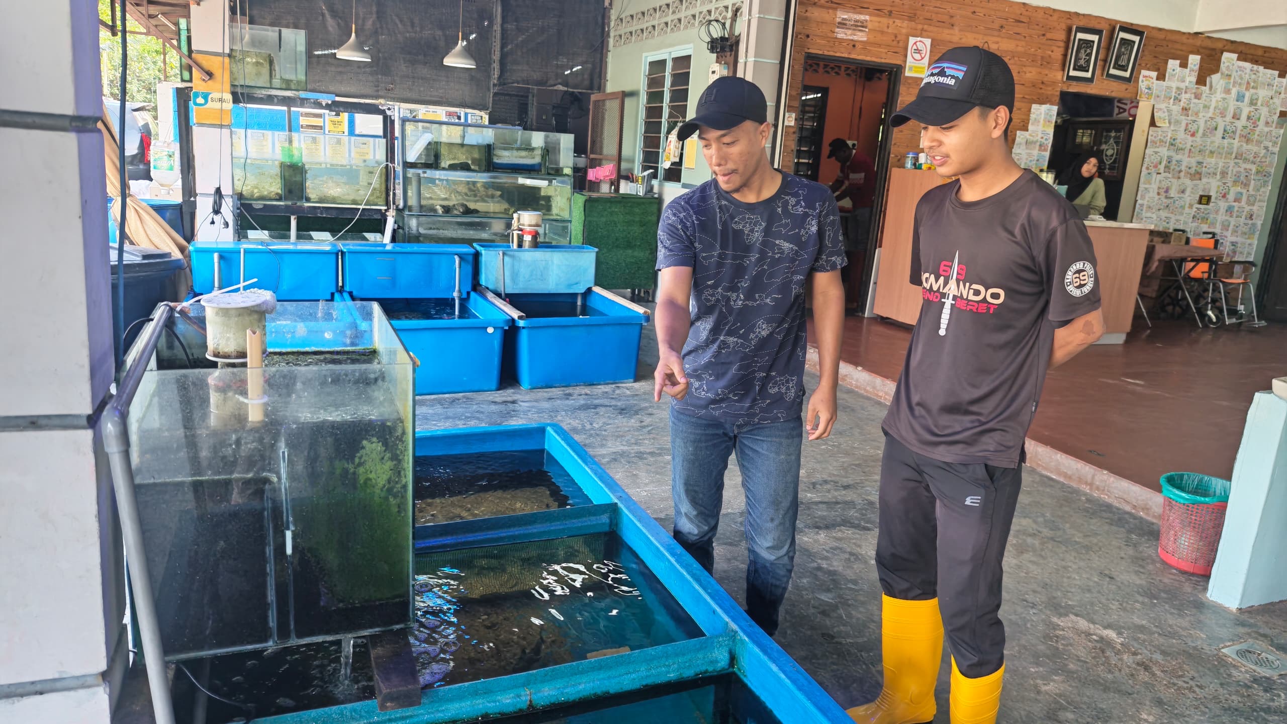DUA pekerja menunjukkan ruang simpanan belangkas yang kini kosong selepas hasil laut hidup itu dicuri dalam kejadian di sebuah kedai ikan bakar di Jalan Jeti Anjung Batu, Umbai, Jasin. - Foto oleh AMRAN ALI/KOSMO!