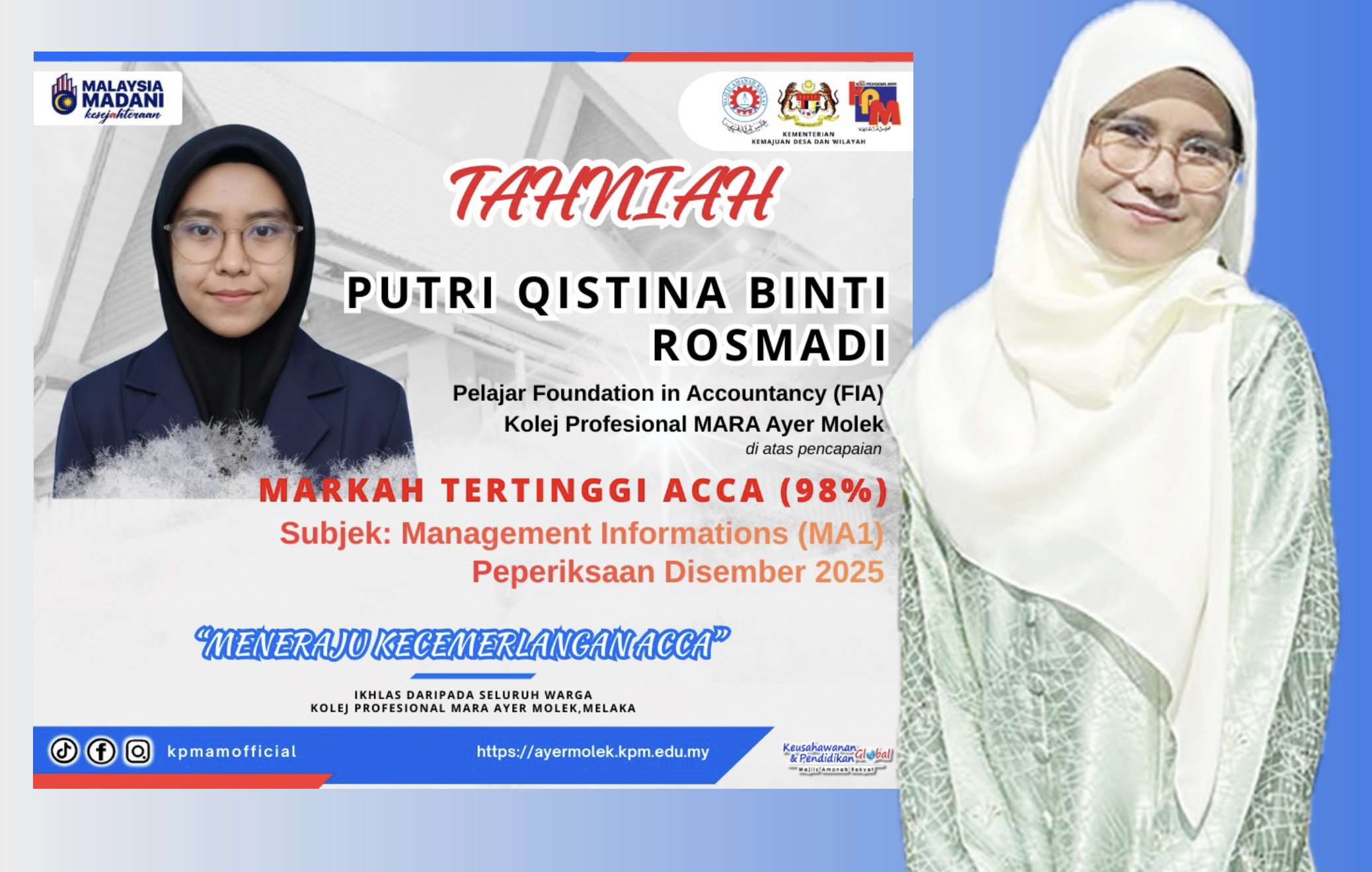 PETALING JAYA – Seorang pelajar Kolej Profesional Mara (KPM) Ayer Molek, Melaka mencetuskan inspirasi apabila dinobatkan sebagai antara pelajar terbaik dunia bagi subjek Management Information (MA1) dalam peperiksaan akaun antarabangsa, ACCA, baru-baru ini. Putri Qistina Rosmadi, 19, yang mengikuti pengajian Foundation in Accountancy (FIA) di bawah tajaan Young Talent Programme (YTP) Mara, membuktikan kehebatannya apabila memperoleh markah hampir sempurna iaitu 98 peratus. Keputusan cemerlang itu diperoleh menerusi peperiksaan yang didudukinya pada 13 November 2025, sebelum beliau secara rasmi diumumkan sebagai……