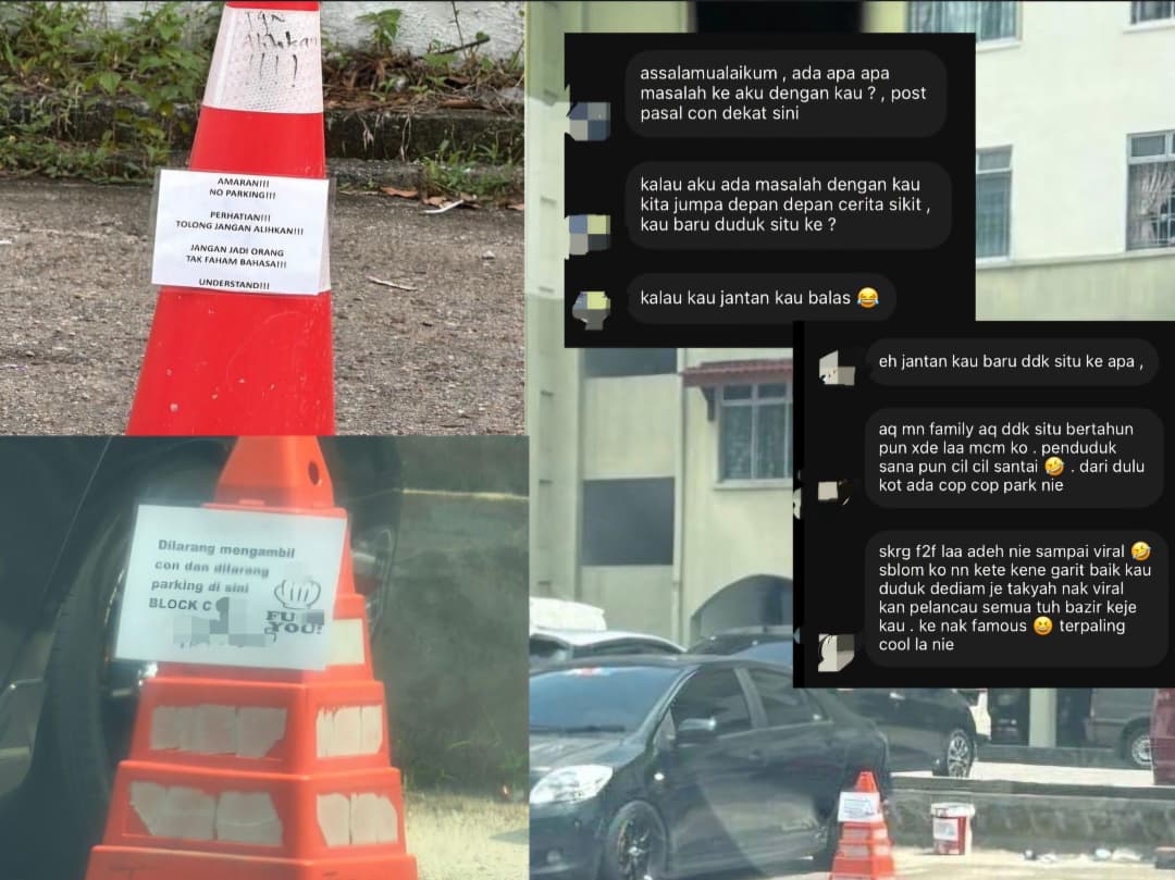 Menggunakan profil @Taqwaasbar di media sosial, lelaki berkenaan turut mendedahkan beberapa gambar lot parkir yang diletakkan kon beserta amaran keras supaya ia tidak ‘diceroboh’ penghuni lain.