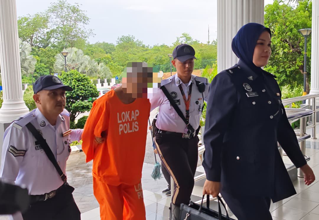Terdahulu, suspek yang memakai baju lokap berwarna ungu tiba di pekarangan mahkamah kira-kira pukul 9 pagi dengan menaiki kenderaan polis.