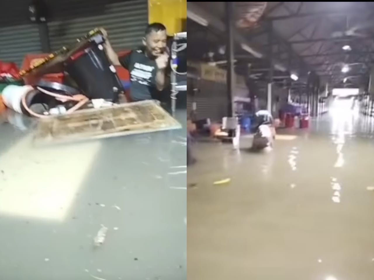Menerusi video tular di media sosial, kelihatan beberapa peniaga dan pekerja medan selera tersebut cuba menyelamatkan barangan dengan keadaan banjir kilat mencecah paras pinggang.