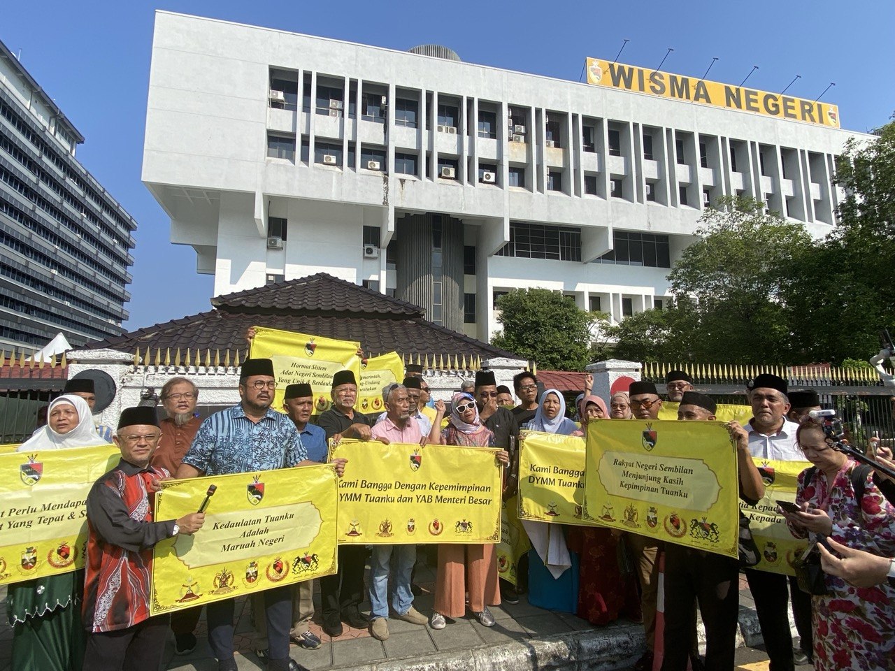SEREMBAN – Lebih 50 orang berhimpun di hadapan Istana Hinggap dan Wisma Negeri di sini hari ini bagi menyatakan sokongan dan taat setia kepada Yang di-Pertuan Besar Negeri Sembilan, Tuanku Muhriz Tuanku Munawir dan Menteri Besar, Datuk Seri Aminuddin Harun.