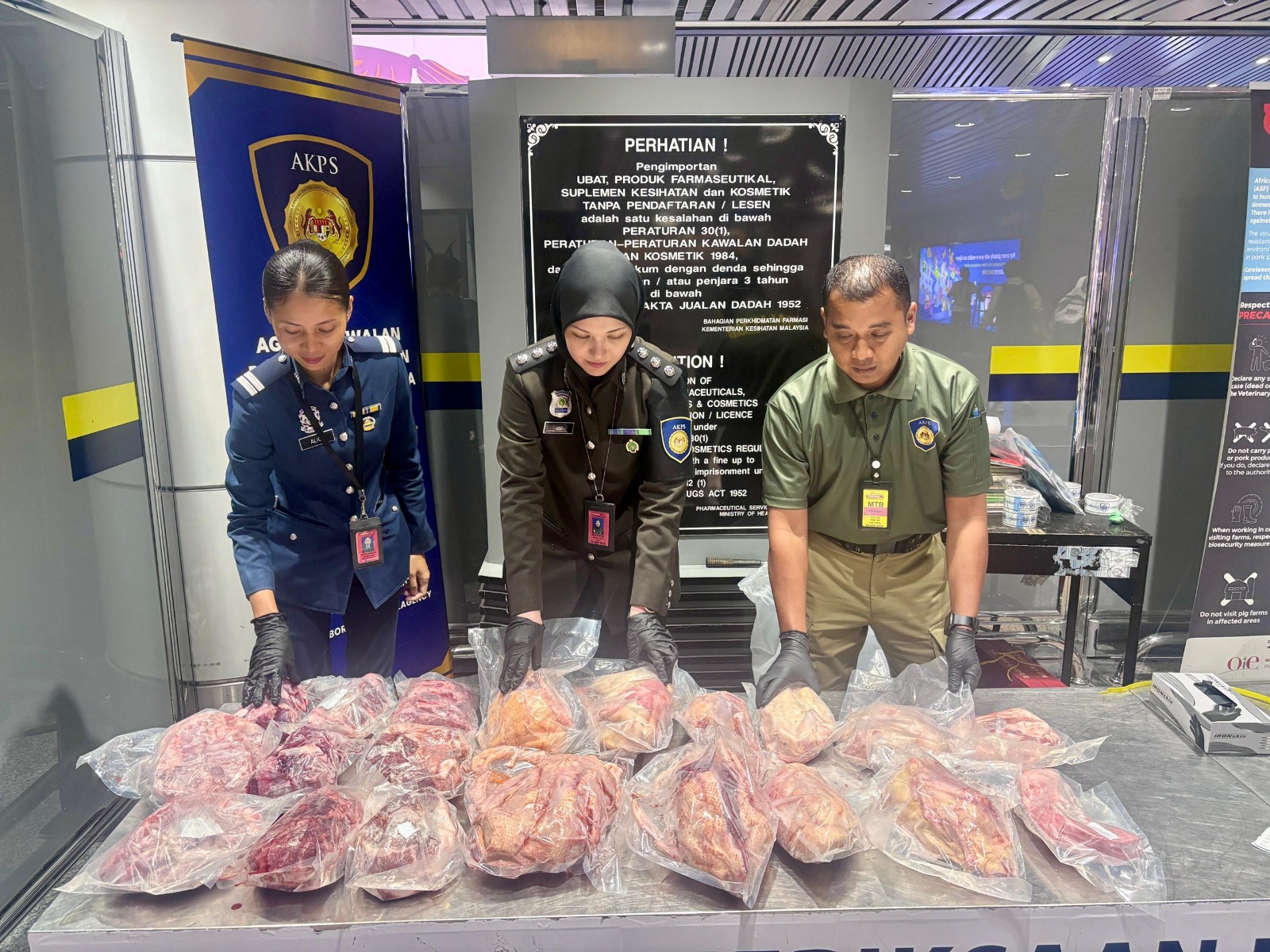 “Antara barangan dirampas termasuk daging itik sejuk beku, ayam bulat dan daging babi tanpa Permit Import MAQIS serta Sijil Kesihatan Veterinar dari negara pengeksport,” katanya dalam kenyataan hari ini.