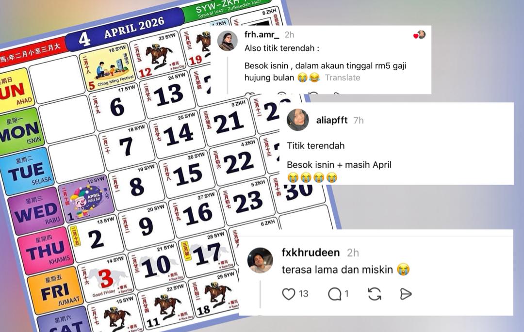 Seorang pengguna Threads @aliapfft berkongsi perasaan tersebut dengan nada bersahaja apabila menyifatkan situasi itu sebagai ‘titik terendah’ apabila esok merupakan hari Isnin, namun masih lagi berada dalam bulan April.