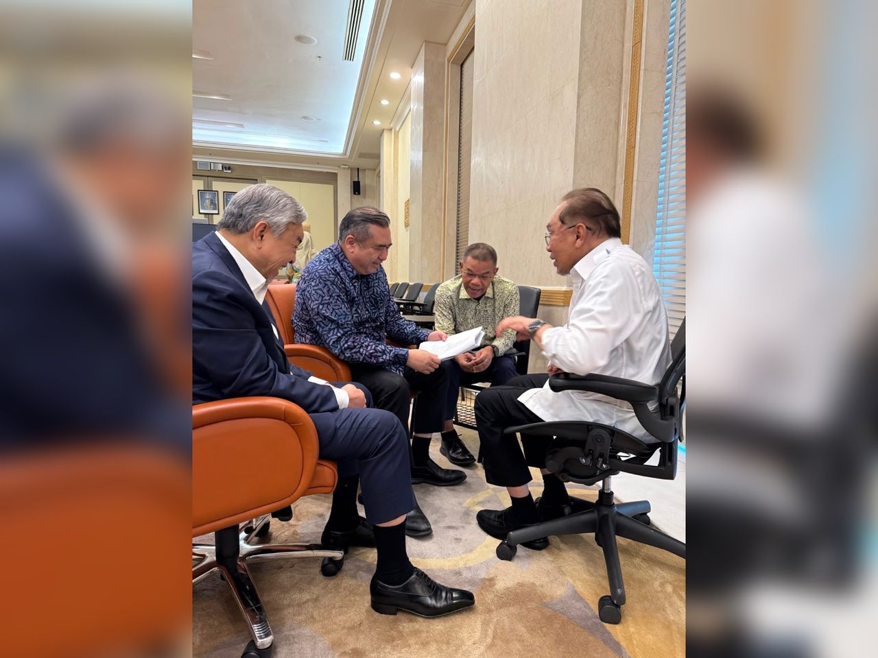 Gambar pertemuan antara Anwar, Ahmad Zahid, Anthony Loke dan Saifuddin yang dimuat naik Fahmi di Facebook, hari ini.