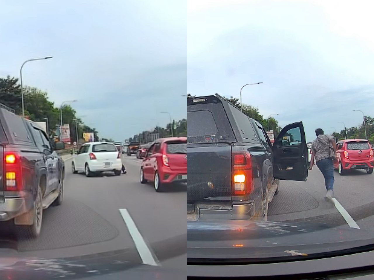 Menerusi rakaman papan pemuka (dashcam) yang dimuat naik di Threads oleh Aathirahrosli, kejadian tersebut memaparkan pemandu berkenaan bertindak pantas turun daripada kenderaannya sebaik menyedari sebuah kereta tersadai di lorong kiri lebuh raya.