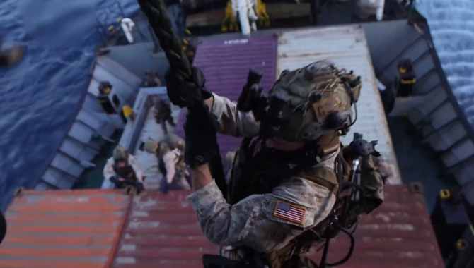 Hantaran itu disertakan klip video menunjukkan sebuah helikopter berlegar-legar di atas kapal tersebut ketika anggota-anggota Marin turun dengan tali ke atas kontena yang disusun di dek.