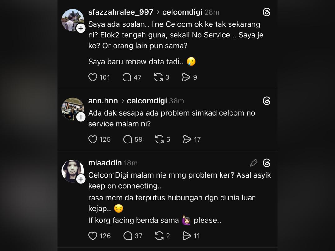 “Saya ada soalan… line Celcom ok ke tak sekarang ni? Elok-elok tengah guna, sekali ‘no service’. Saya je ke? Atau orang lain pun sama? Saya baru renew data tadi,” tulisnya.