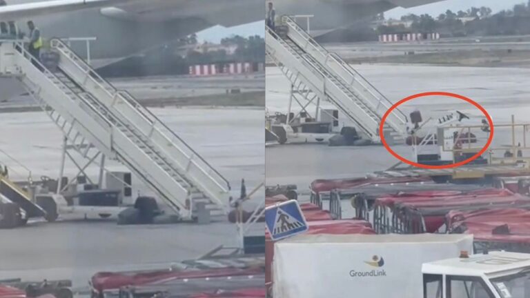 Pekerja lapangan terbang baling bagasi penumpang dari atas pesawat