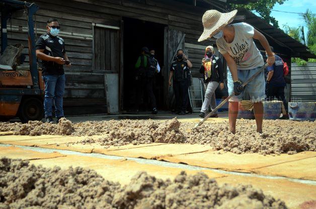 Pekerja pijak belacan semasa proses menjemur