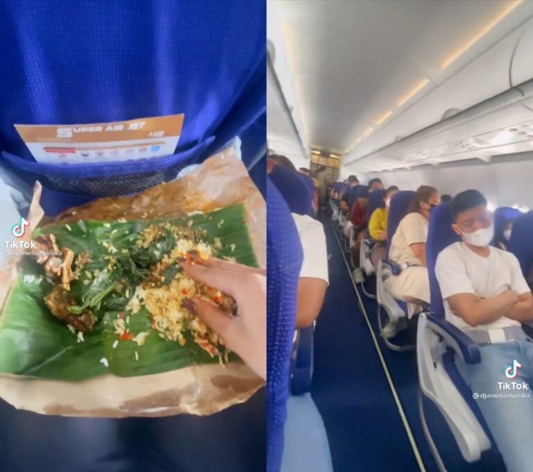 Wanita selamba makan nasi padang bungkus di dalam pesawat