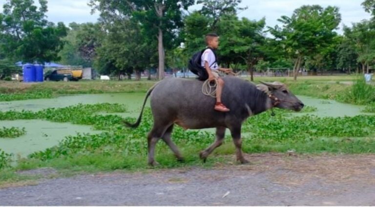 Murid tunggang kerbau ke sekolah