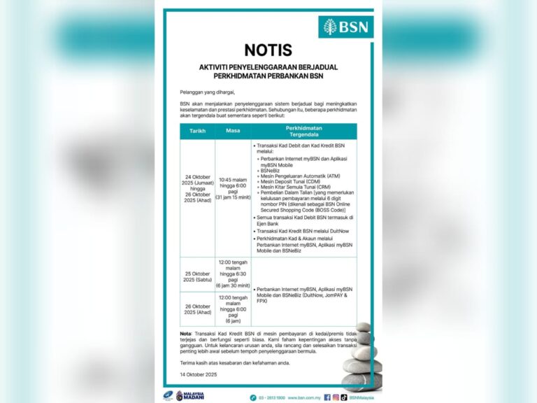 Beberapa perkhidmatan BSN tergendala bermula 24 hingga 26 Oktober