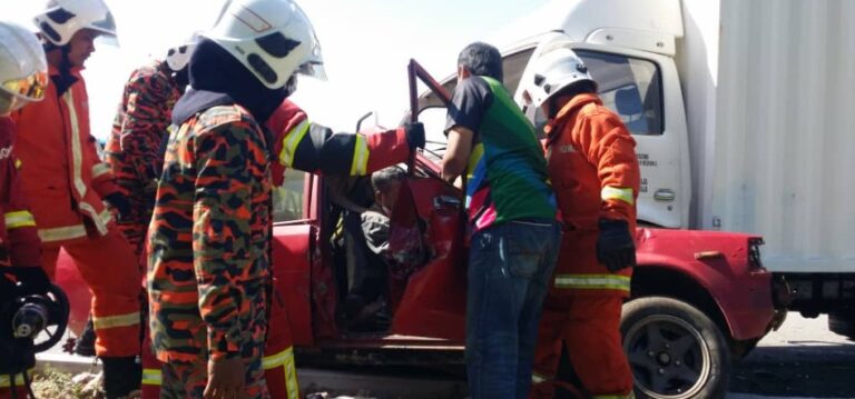 Peniaga parah kereta bertembung lori