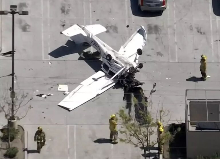 Pesawat langgar tiang elektrik, terbalik di tempat letak kereta